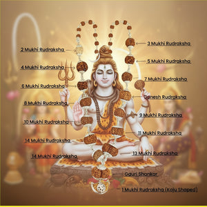 A sacred and powerful mala featuring natural 1 to 14 Mukhi Rudraksha beads, along with rare Ganesh Mukhi and Gaurishankar Rudraksha—all of Nepalese origin. This divine combination holds immense spiritual power and is ideal for seekers, healers, and sadhaks on a higher spiritual path.