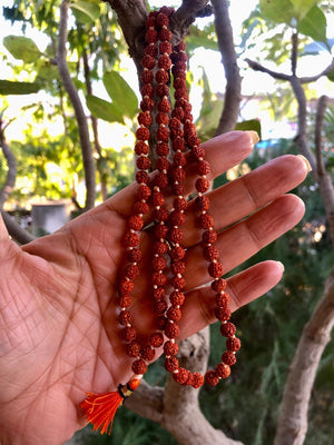This mala is made of panchmukhi or five-faced rudraksha beads, which are considered to be the most auspicious and beneficial for health and well-being.
