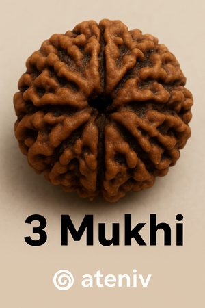 This sacred bead is a 3 Mukhi Rudraksha, characterized by its three distinct natural lines (mukhis) running from top to bottom, symbolizing the holy trinity of Hindu gods: Brahma (the Creator), Vishnu (the Preserver), and Shiva (the Destroyer). It is primarily ruled by Agni (the Fire God), embodying the transformative power of divine fire that purifies and renews
